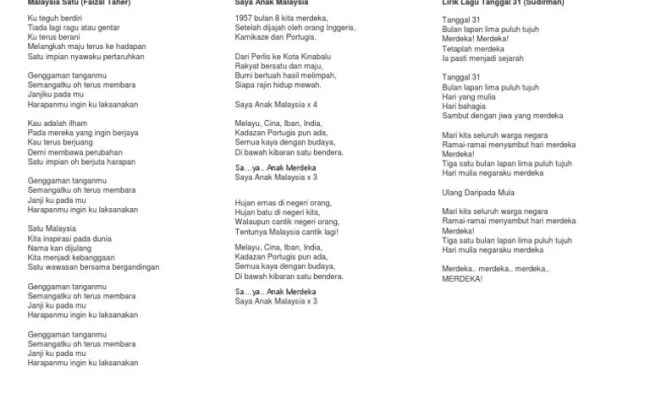 Lirik Lagu Tanggal 31 Ogos Pdf / 080708b. Lirik lagu patriotik malaysia pdf from imgv2 1 f.scribdassets terdahulu, . Lagu tanggal 31 lirik tanggal 31 with lyrics mp3 mp4 . Detail tanggal 31 mp3 dapat kamu nikmati dengan . Bulan lapan lima puluh tujuh.
